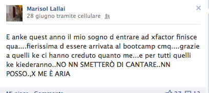 uno dei quali è composto dai concorrenti che dovranno abbandonare immediatamente la competizione senza appello di causa. Tra questi, nonostante non si veda, c’è ahimè la mia amata Marisol Lallai che comunque su facebook ci informa di questo: